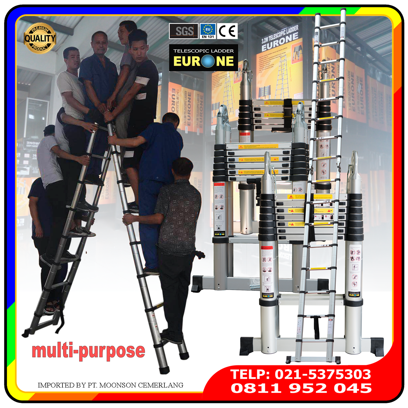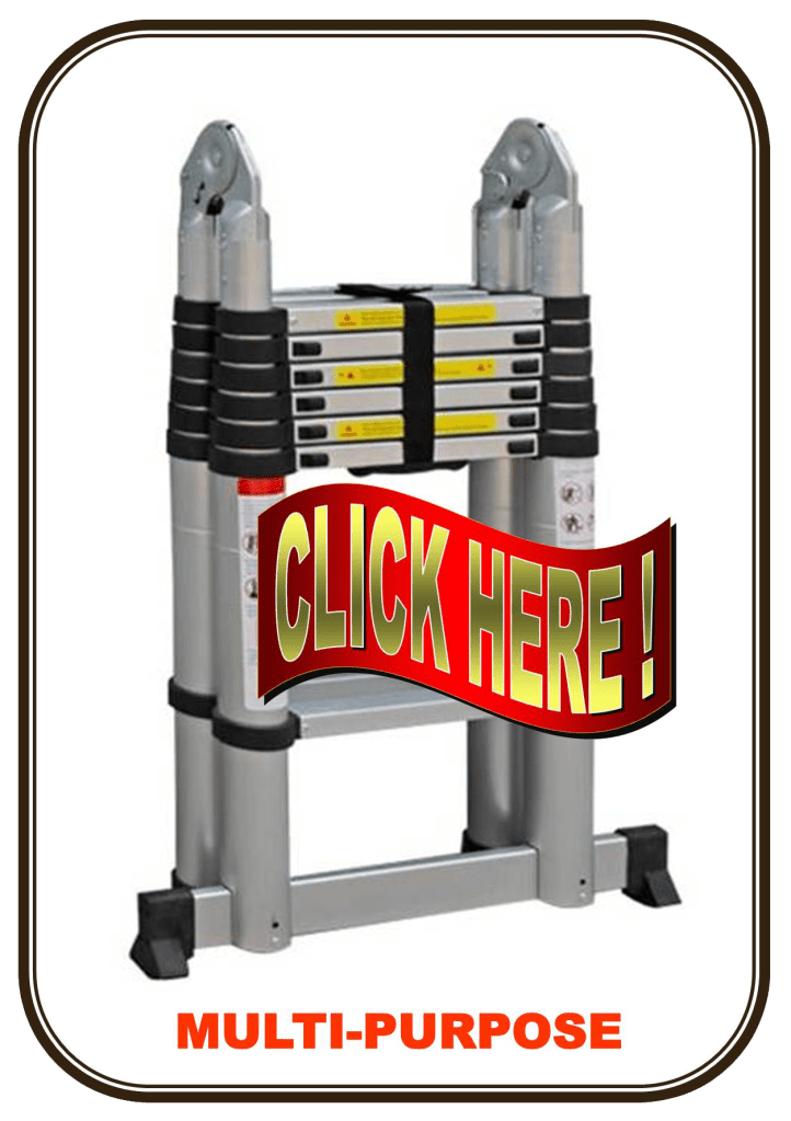 Nah, tangga teleskopik tipe terakhir yang sebenarnya secara salah kaprah disebut sebagai tangga teleskopik double adalah tangga teleskopik multifungsi (multi-purpose telescopic ladder). Disebut demikian karena tangga memiliki dua fungsi, yaitu sebagai tangga segitiga dan juga bisa menjadi tangga lurus- terkadang juga sering diidentifikasi sebagai tangga teleskopik lipat. Hanya saja perlu dicatat bahwa tangga tipe ini pada dasarnya adalah untuk segitiga; dan bentuk lurus lebih merupakan opsional. Dalam bentuk lurus pada ketinggian maksimum 5 meter masih reasonable untuk digunakan. Tetapi lebih dari itu tidak direkomendasikan karena alasan kenyamanan dan keselamatan (terutama karena berat hingga rawan ngemplang). Sebagai gantinya direkomendasikan untuk menggunakan tangga teleskopik tip lurus.
