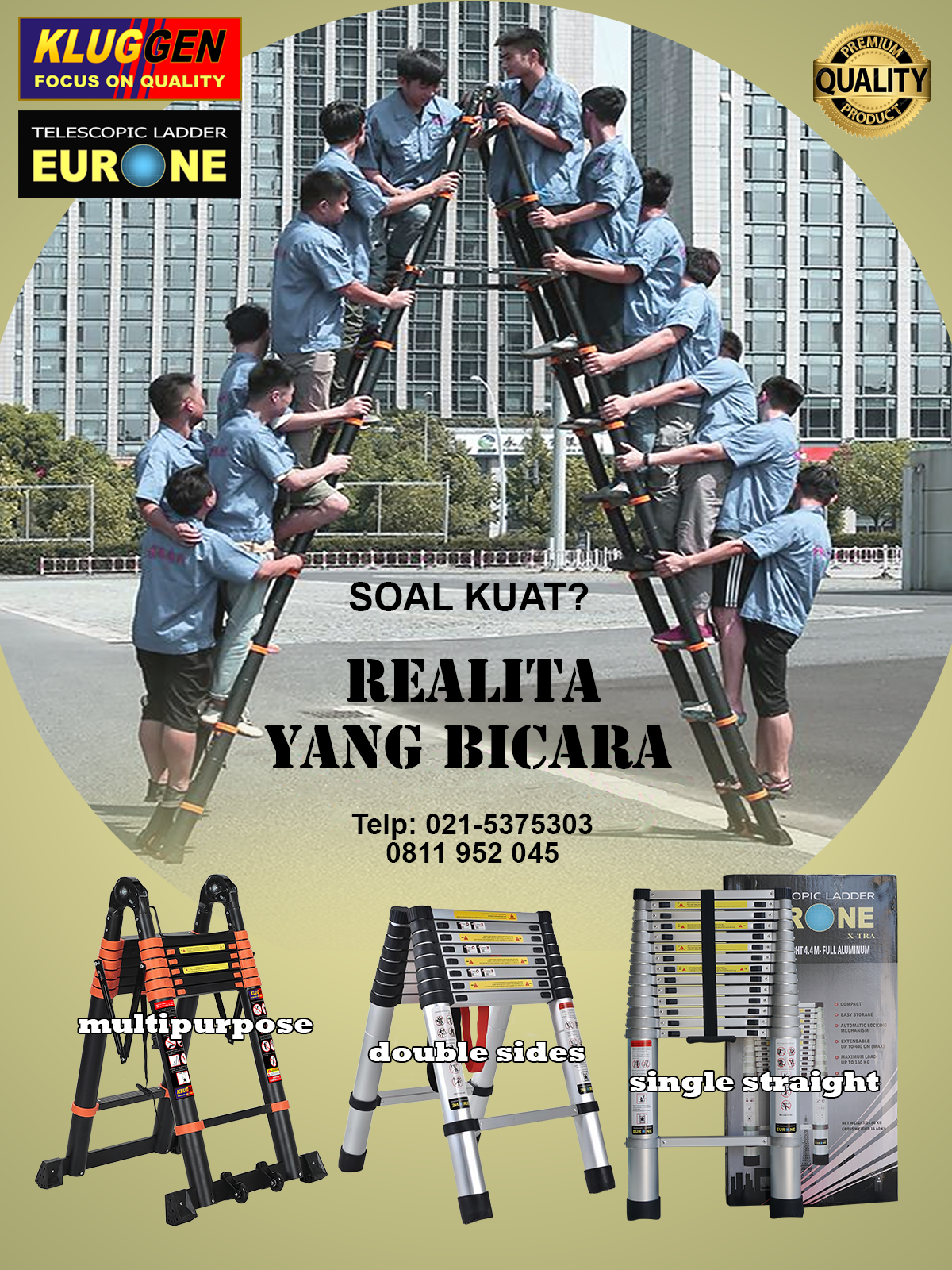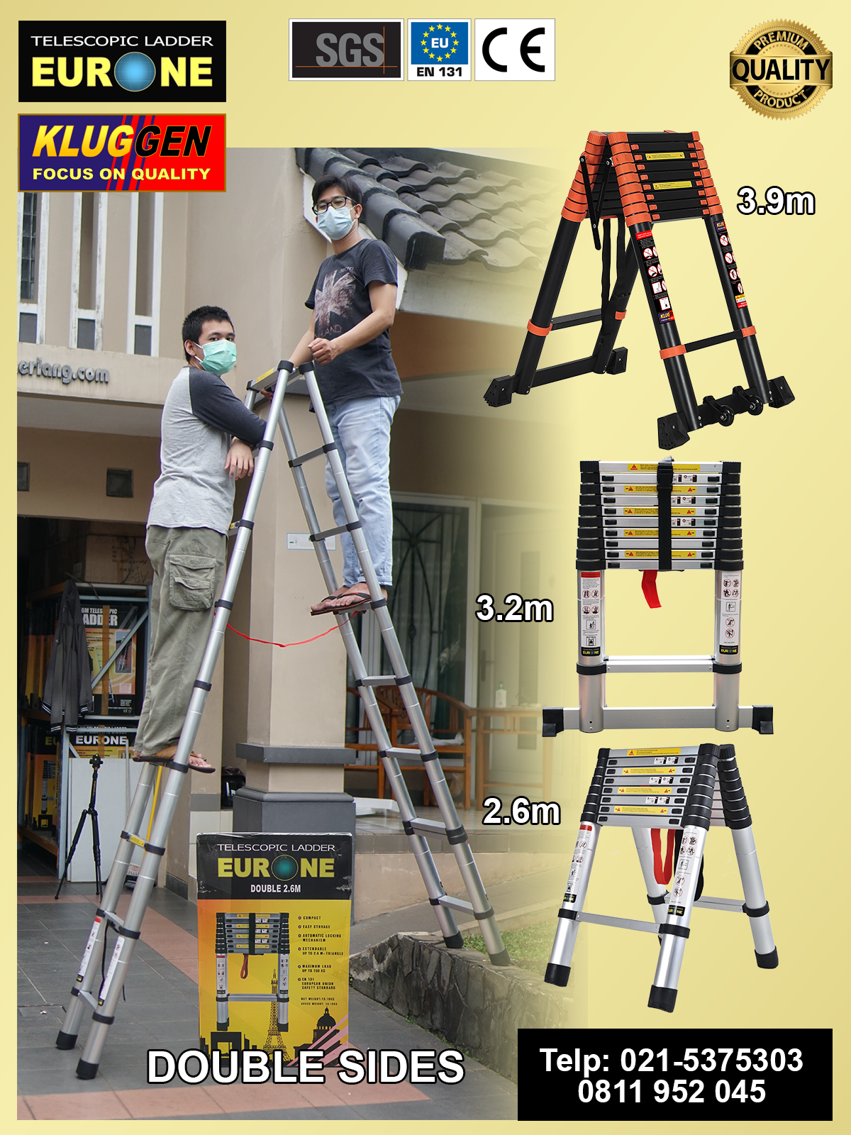 Mungkin pertanyaan besar berikutnya yang terbesit di benak anda adalah tentang bagaimana kekuatan tangga. Mengingat tangga terbentuk dari susunan potongan-potongan pipa mirip seperti antena radio atau payung lipat. Bila dijelaskan dengan kata-kata tampaknya itu sudah hal biasa. Akan tetapi gambar di atas adalah fakta dari realita- jauh dari sekedar bualan atau hoax. Memang tidak semua tangga aluminium teleskopik berkualitas baik; tetapi anda bisa percayakan pada merek Eurone dan Kluggen- seperti logo tertera pada gambar.