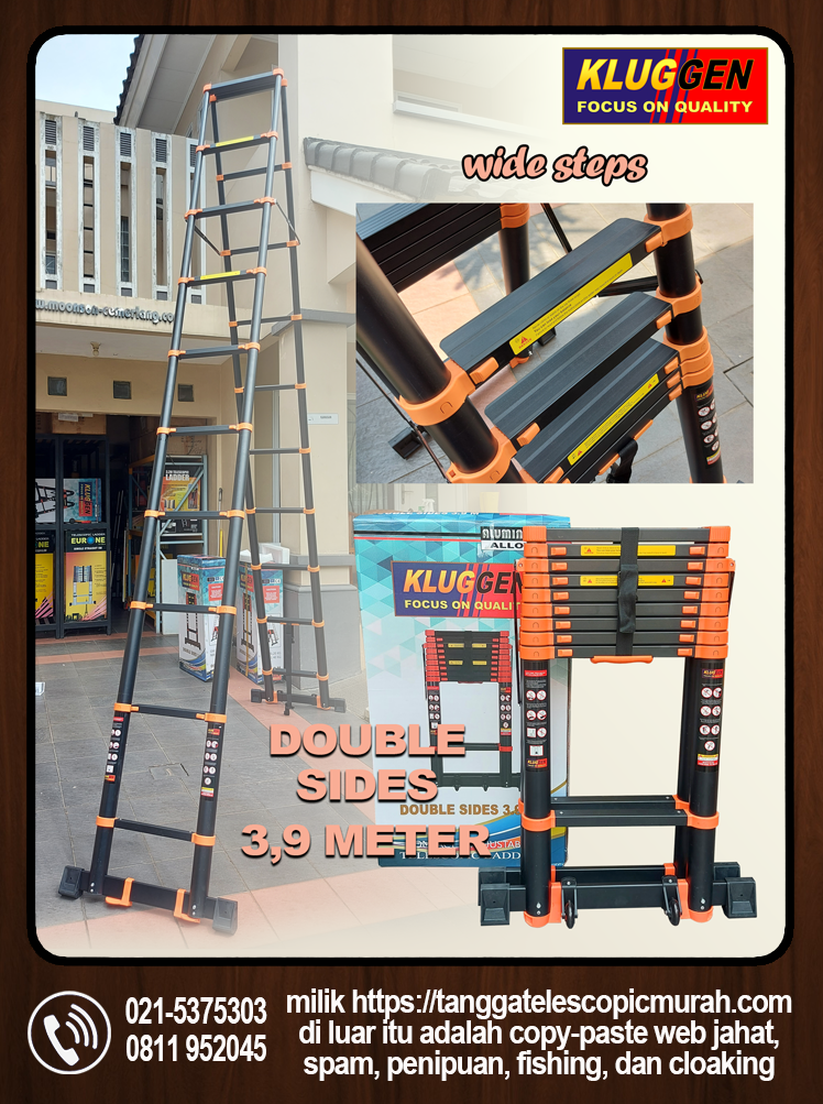Apabila yang anda butuhkan adalah tangga segitiga dengan tinggi sekitar 4 meter atau sebut saja tangga A 4 meter, maka pilihan yang tepat adalah tipe double sides 3.9m. Tangga ini memiliki ketinggian yang sama dengan tipe multipurpose 4.1+4.1m/8.2m karena anak tangga paling atas tipe multipurpose tidaklah mencapai titik puncak di ketinggian 4,1 meter melainkan turun di bawahnya menjadi 3,9 meter. Memang tipe multipurpose memiliki keunggulan dalam bentuk segitiga lebih kekar, tetapi ketinggian 8,2 meter secara lurus boleh dibilang gak layak pakai karena sangat berbahaya. Pertama karena joint tidaklah sekuat dan sekekar yang kita harapkan dimana tangga akan tampak bengkok ketika dipanjat sehingga bila kita memanjat pertengahan ke atas akan terlalu vertikal, ditambah lagi tangga yang goyang akan menambah resiko terjungkal. Kedua, berat tangga multipurpose 4.1+4.1m/8.4m sekitar 29 kg akan sangat tidak sehat untuk tulang belakang anda saat menegakkannya; dan yang lebih berbahaya lagi adalah tatkala sedikit saja tangga oleng, maka anda tak kuat menahannya dari bawah, lalu tangga ngemplang menimpa sekitarnya- super berbahaya! Karena itu cukuplah menggunakan tipe double sides 3.9m. Inipun sudah sangat tinggi; anda sebaiknya meminta bantuan sesorang untuk memegang dan menahan dari bawah bila anda hendak memanjat dengan ketinggian maksimum. Lebih jelasnya, silahkan klik dan saksikan VIDEO-nya.