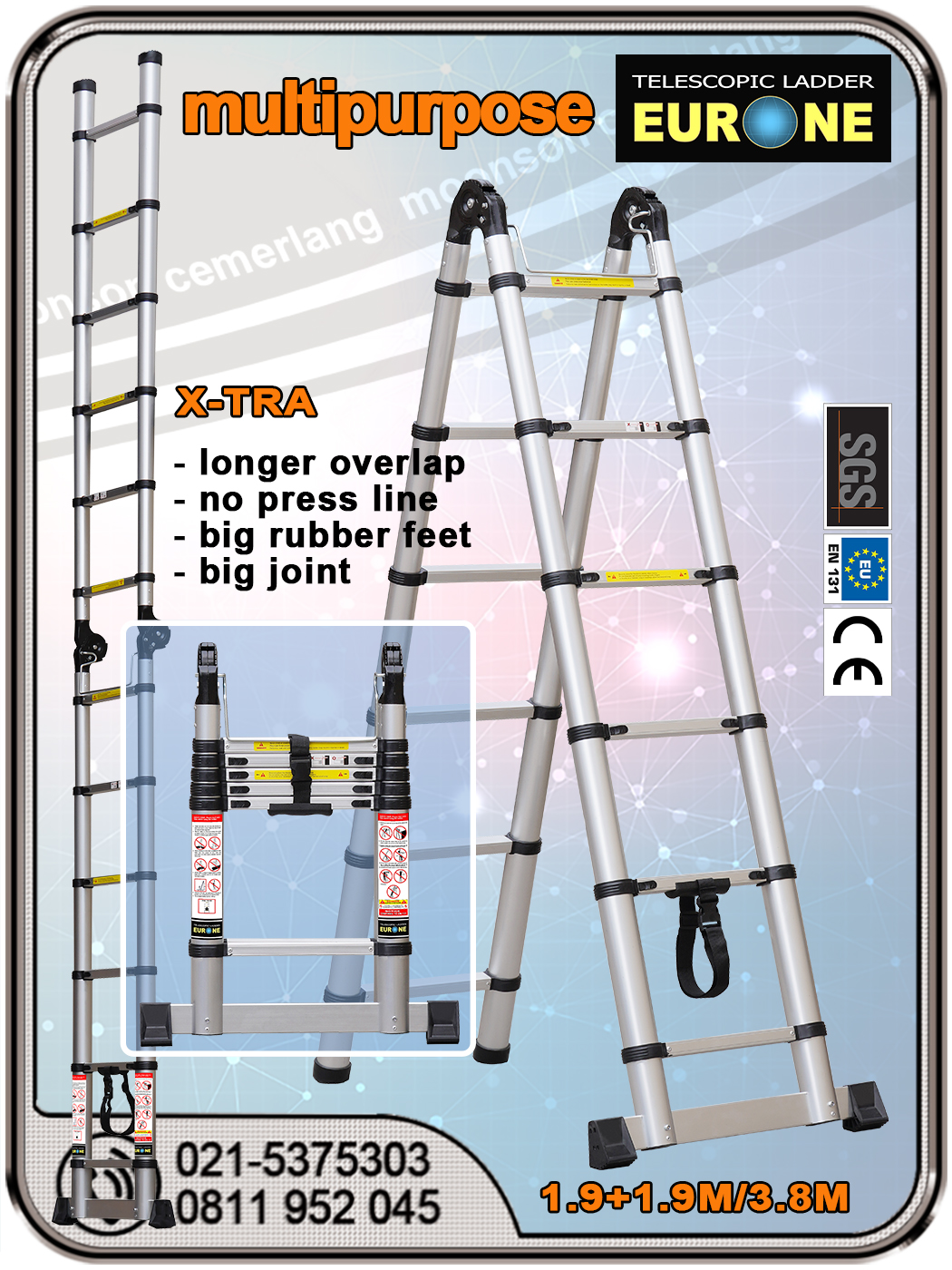 Pada gambar pertama sebagaimana terlihat di atas, kami sediakan ukuran 1.9+1.9m/3.8m merek Eurone. Secara segitiga, tangga dapat ditegakkan hingga 1,9 meter dan dapat tegak pada permukaan miring atau jomplang; dan bila dibentang lurus bisa mencapai 3,9 meter (maksimum). Tangga tsb. memiliki kualitas di atas rata-rata karena setidaknya punya 4 keunggulan yaitu: overlap panjang 13 cm (umumnya hanya 10 hingga 11 cm), tanpa press line, joint besar, dan karet kaki tangga yang juga besar. Bila ingin sedikit lebih tinggi, tersedia ukuran 2.5+2.5m/5m merek Kluggen dengan kualitas premium.