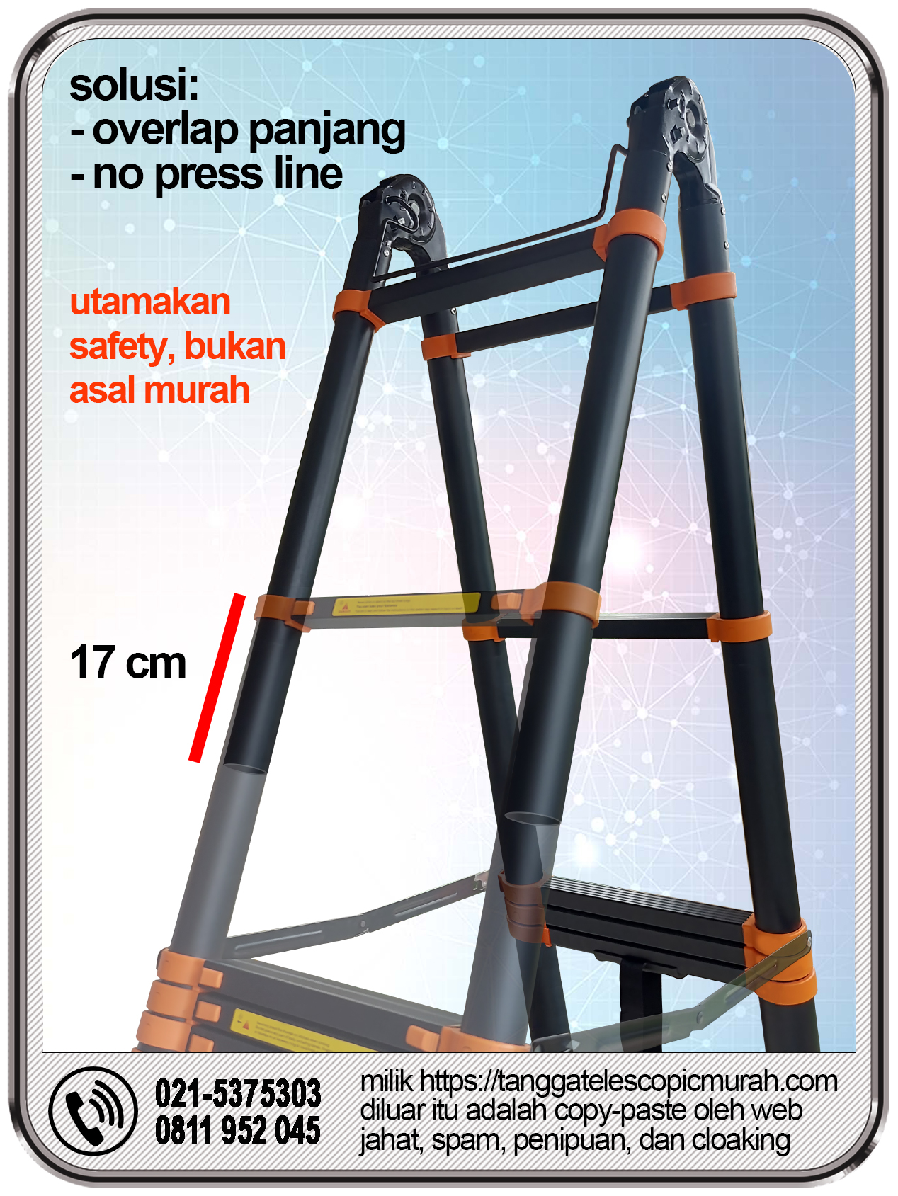 Postingan ini fokus pada isu overlap saja; sedangkan isu material akan dibahas pada postingan lain- namun untuk sementara dapat dilihat melalui Youtube video short (silahkan klik) yang kami sediakan. Banyak sekali orang mengira bahwa kekuatan tangga teleskopik ditentukan oleh ketebalan pipa, tanpa menyadari soal overlap. Secara logika, memang benar ketebalan pipa bisa menentukan kuat-tidaknya sebuah tangga. Tetapi sayangnya karena alasan teknis, maka ketebalan pipa sejauh ini adalah standar, yaitu 1.3-1.5 mm. Overlap pipa lah yang berbeda-beda dan menjadi tumpuan untuk membuat sebuah tangga teleskopik kuat dan kekar atau tidak. Semakin panjang overlap pipa maka tangga akan semakin kuat dan kekar, tetapi biaya produksinya jadi mahal. Sebaliknya semakin pendek overlap pipa yang digunakan maka tangga akan semakin goyang dan melengkung bila dipanjat, tetapi di sisi lain biaya produksinya lebih rendah sehingga bisa jual murah dan laris manis. Tidak sedikit laporan dari para pengguna tangga teleskopik, khususnya para profesioanal yang sehari-hari memang bergelut dengan tangga, dimana tangga yang mereka beli dari penjual lain telah mencelakakan mereka akibat goyang, melengkung, dan bahkan patah.